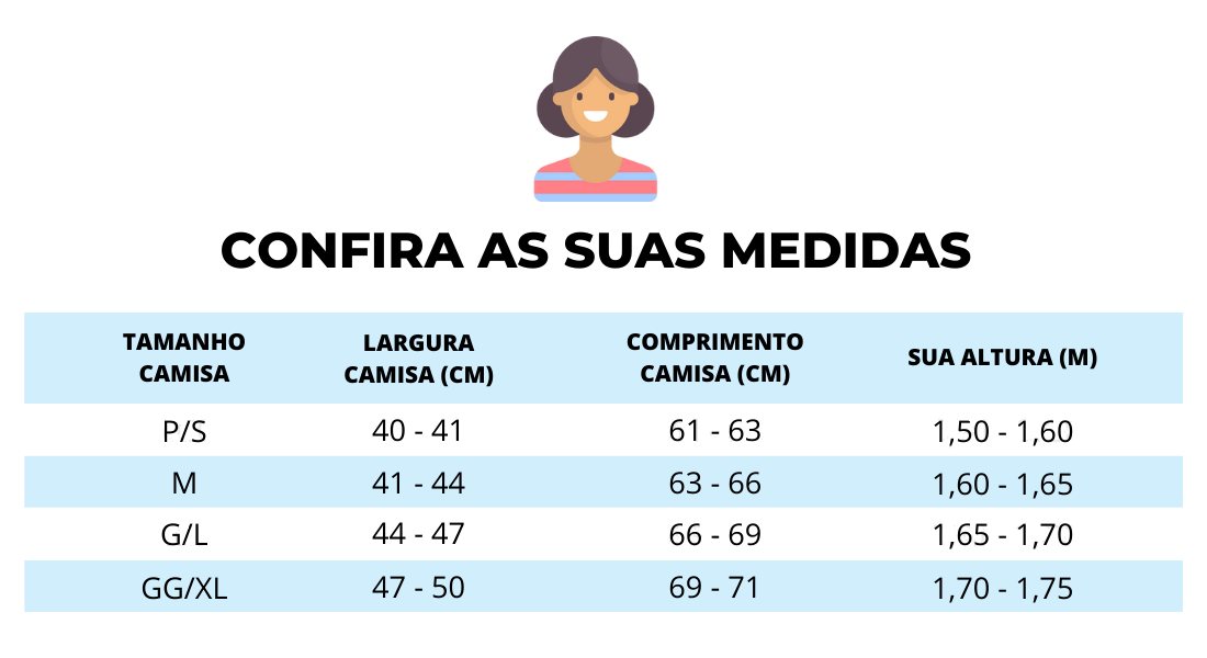Considere adquirir um tamanho maior caso deseje um caimento mais solto.